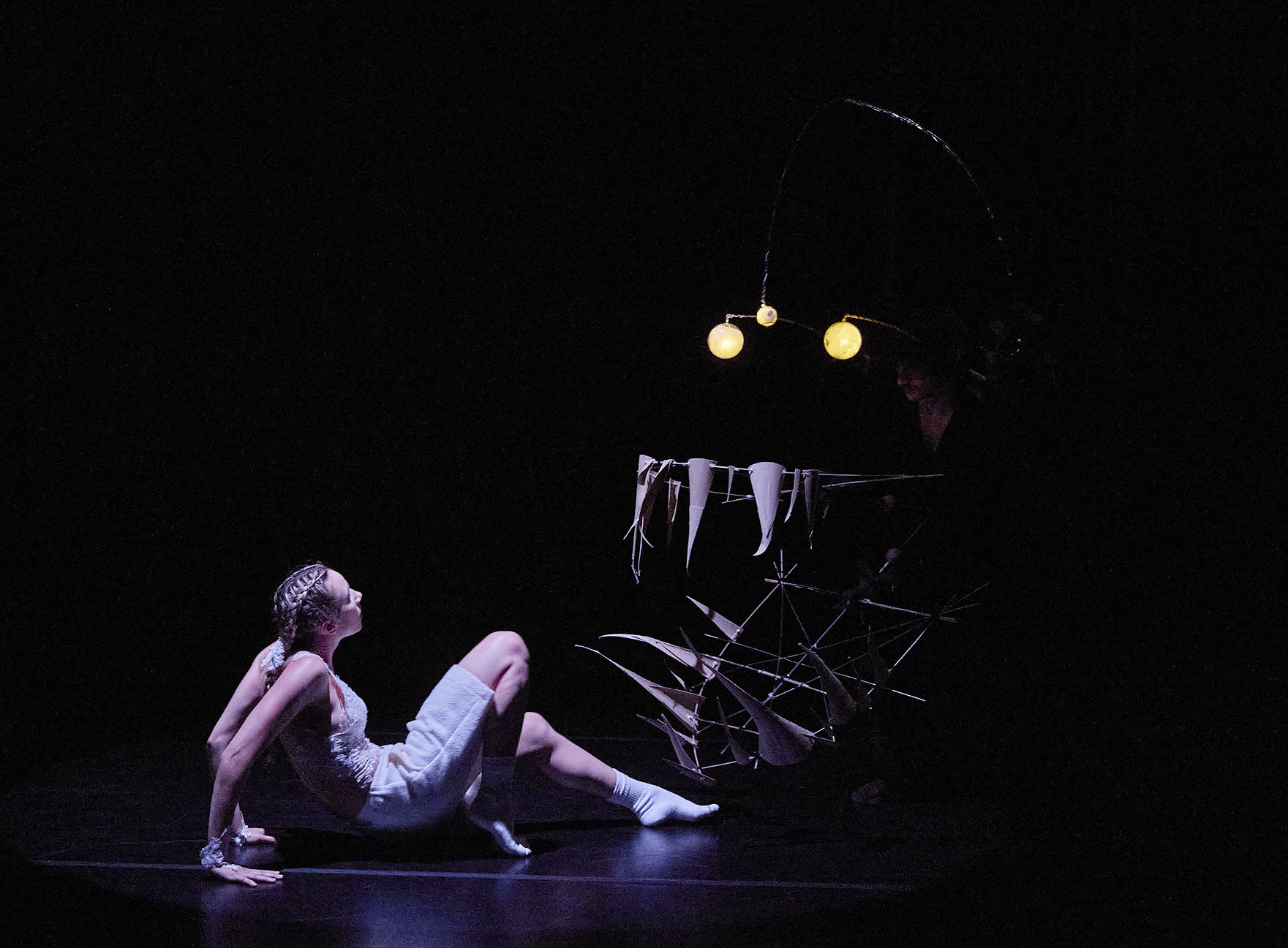 When darkness envelops us, the only light to reveal things is our imagination. Better then to dive into this deep ocean, where ideas are born, dissolve and recompose themselves in labyrinthine emotional scenarios. Two humans, two guardians and two imaginary friends take us into the Silent Carnival of the underworld where madness, fears and the human and animal connection inevitably dance toghether.